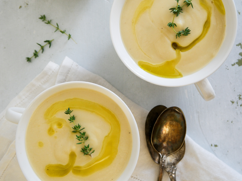 6. Serve immediately with a drizzle of olive oil and some fresh thyme leaves. Soup can also be frozen for up to 2 months. Defrost in the refrigerator and reheat gently on the stovetop over low heat.