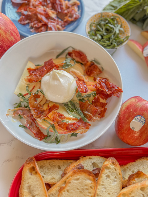 This recipe is a delightful blend of textures and flavors, with the crisp sweetness of thinly sliced Fuji apple taking center stage. The apple provides a refreshing crunch that pairs perfectly with the creamy richness of burrata and the savory crispness of prosciutto. Drizzled with honey and accented by the herbal notes of fresh basil, this dish is a harmonious combination of sweet, savory, and tangy elements. The golden, olive-oil- brushed crostini add the perfect finishing touch, making every bite irresistible. Perfect as an appetizer or a light snack, these crostini are sure to impress!