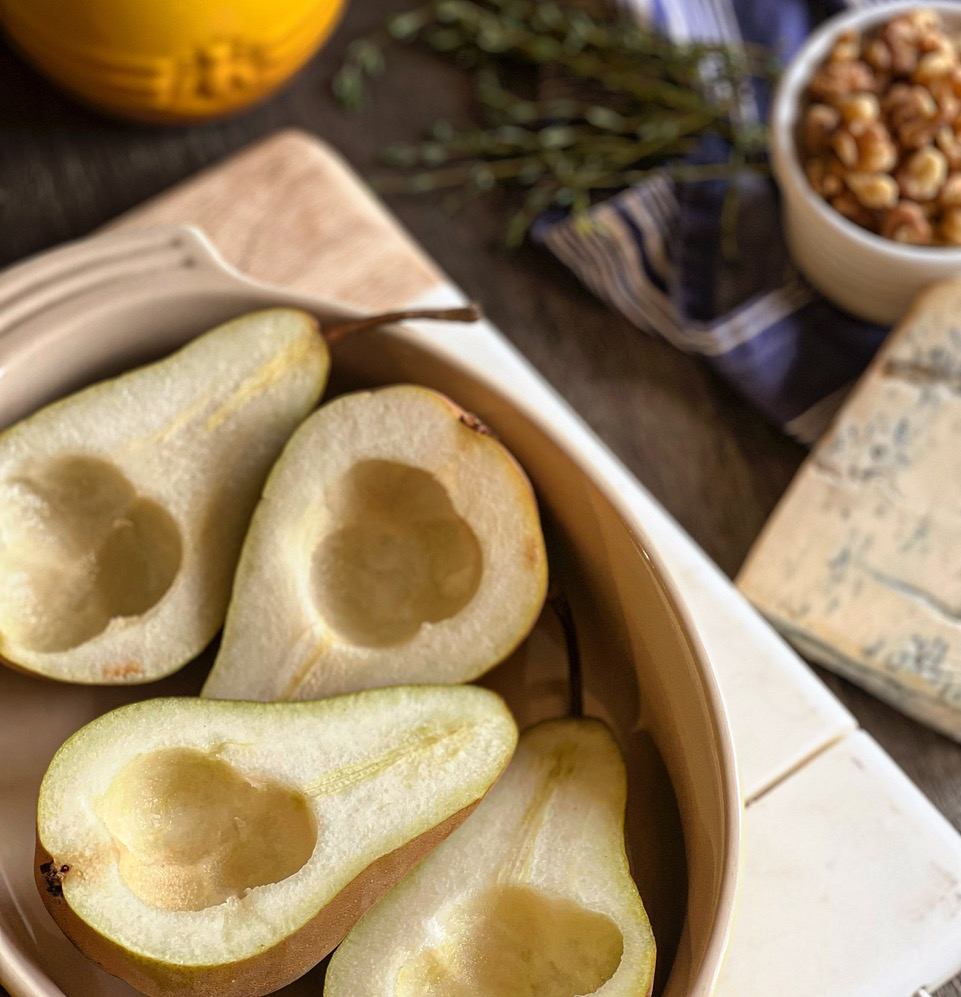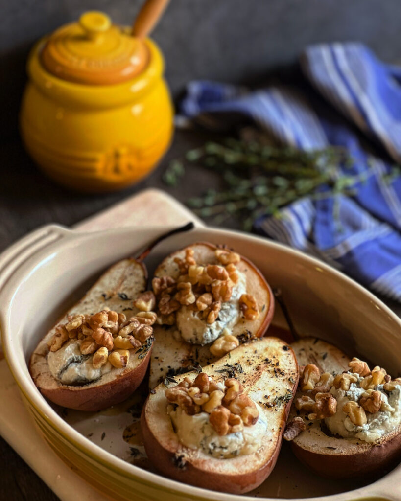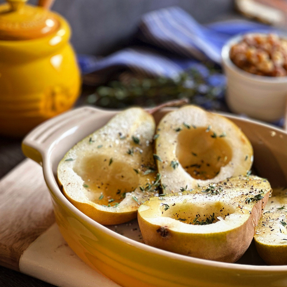 This luxurious combination is the ideal starter. Bosc Pears are the perfect choice; their elegant long neck and curved stem make them a feast for the eyes. Since they are a firm variety, they withstand the baking process well and hold together for individual plating. Topped with a drizzle of honey and fresh thyme, this is a side to remember. They are delicious warm or cold, and this will not make you cramped on time. You can have these on the table in less than 30 minutes!