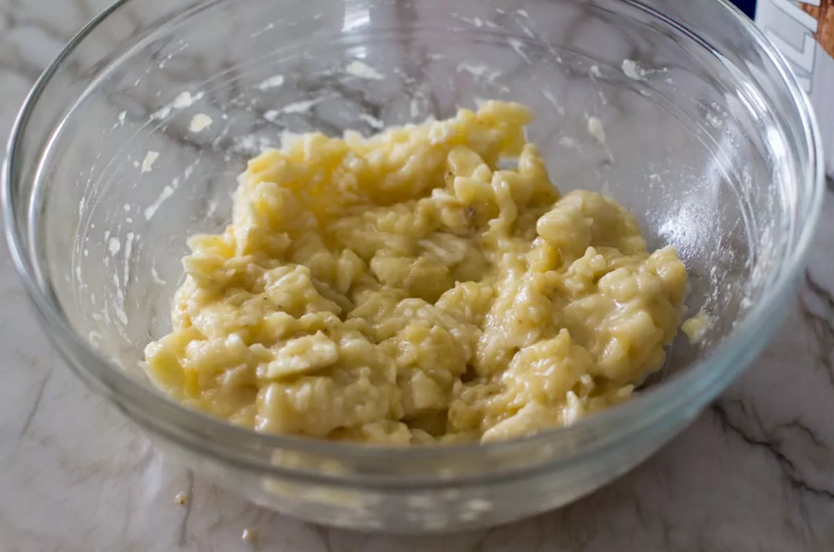 - This is your classic one bowl recipe! It’s super easy, so don’t blink or you might miss it. First, smash your bananas.
