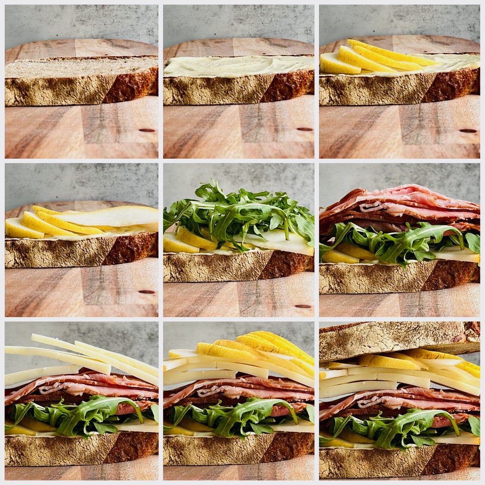 - Assemble, by layering, bread, mayonnaise/Dijon spread, pear, arugula, ham, Manchego cheese, more pear and top with another slice of bread, butter side up!