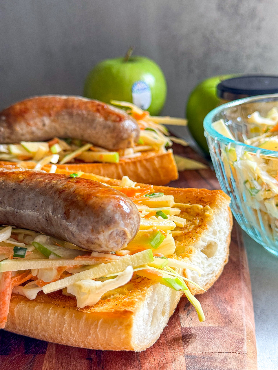 This recipe brings together savory bratwursts and a bright, crisp apple slaw to create a perfect combination of flavors and textures. The trick to getting juicy, tender brats with a crisp outer layer is boiling them before browning—whether you choose beer or water, this step is essential. Pair them with tangy green apple slaw and a toasted hoagie roll for a delicious bite.