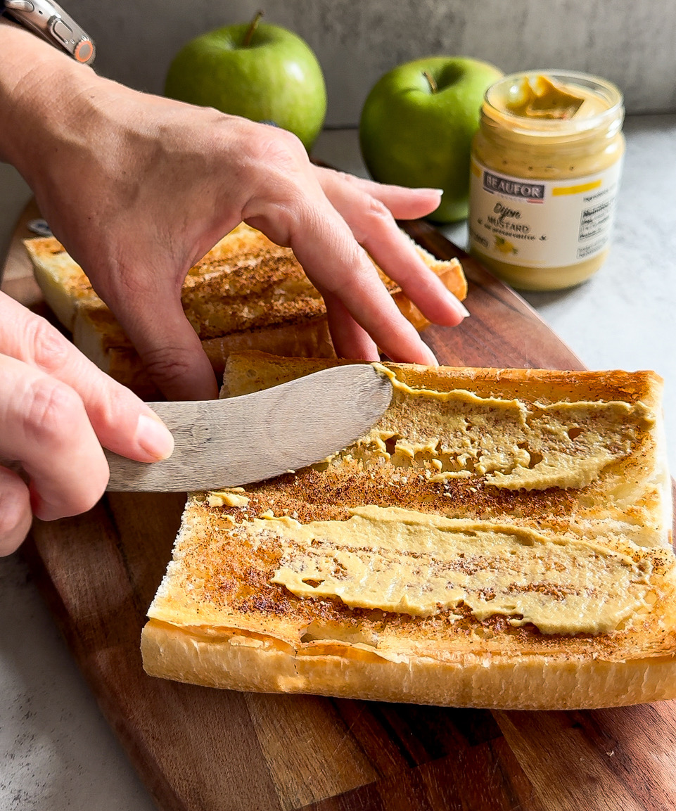 - Spread Dijon mustard on the toasted hoagie rolls.