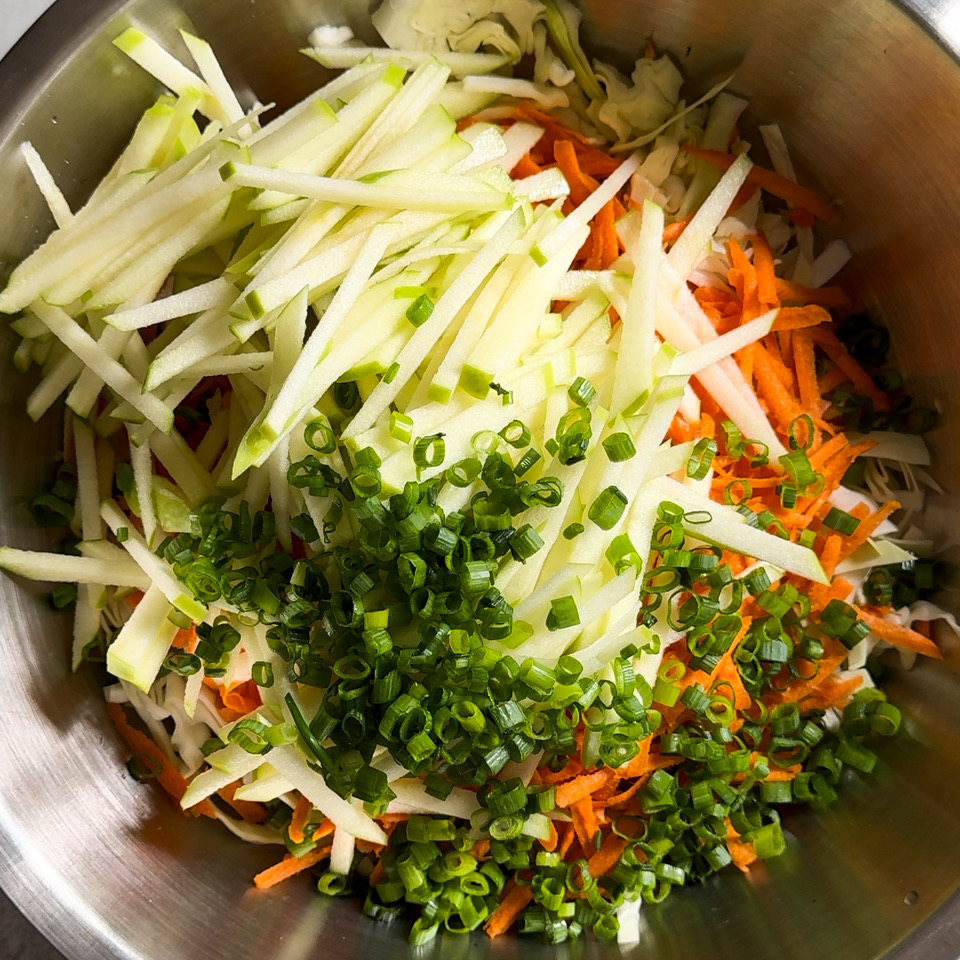 - In a large bowl, combine the chopped cabbage, julienned apples, grated carrots, and chopped green onions.