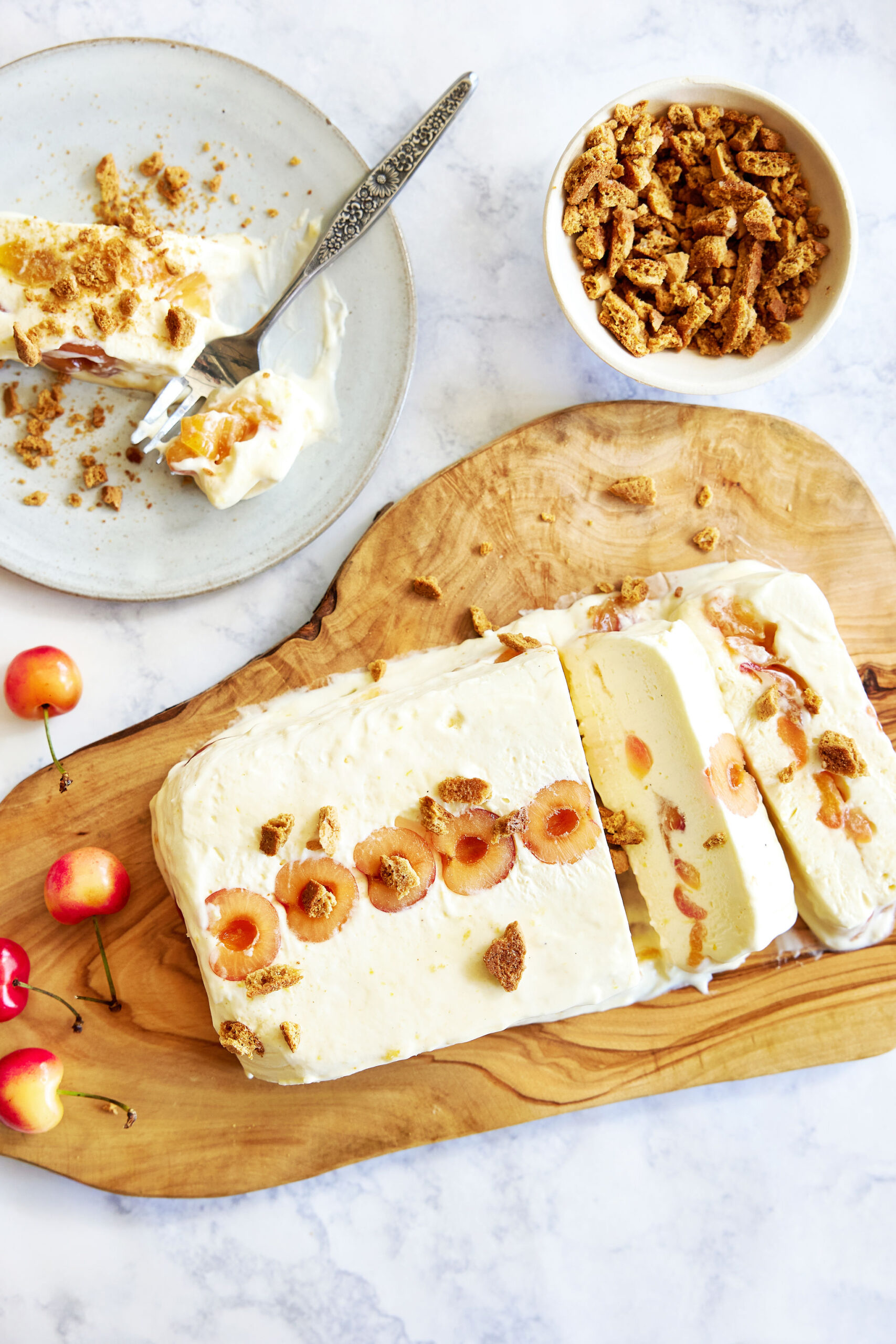 - When ready to serve, unwrap the top of the semifreddo and use the plastic wrap to help lift it out of the pan. Slice the semifreddo into thick slices and serve immediately. Garnish with additional lemon zest, fresh cherries, and crushed gingersnaps if desired.