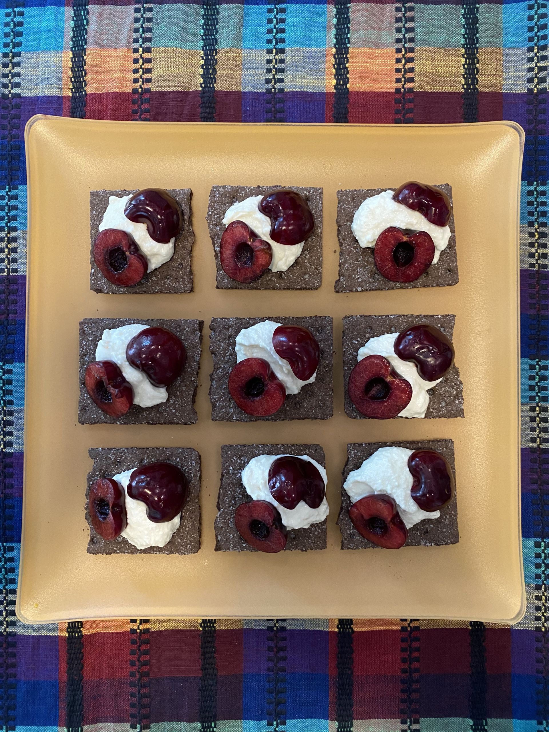 - In a small bowl, mix together the ricotta, honey and orange rind and blend until smooth. Spoon approximately 1 TBSP of the ricotta mixture on each graham cracker square and top with 2 cherry halves.