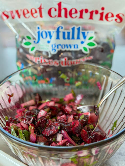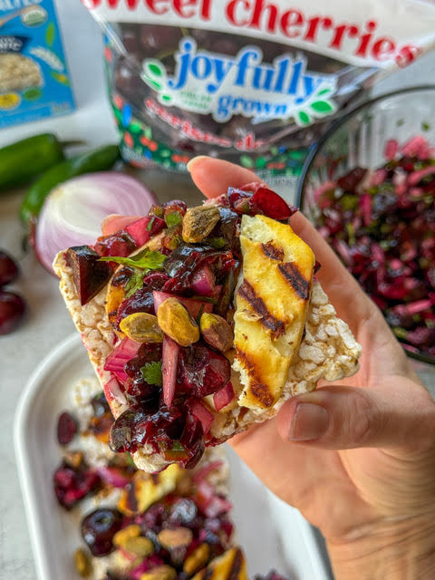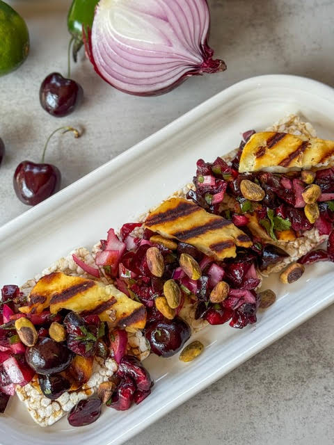 of sweet red cherries, creating a flavor contrast that’s both unexpected and unforgettable. The cherries bring a natural burst of sweetness that balances the savory cheese, while fresh herbs, lime, and a touch of heat from jalapeño round out the salsa with depth and brightness. Each bite is a celebration of peak-season cherries, ripe, ruby-red, and full of flavor, elevating this simple dish into something truly special. Served on top of a crisp, over arugula or warm flatbread and topped with pistachios or a drizzle of hot honey, it’s a showstopper you’ll crave all summer.
