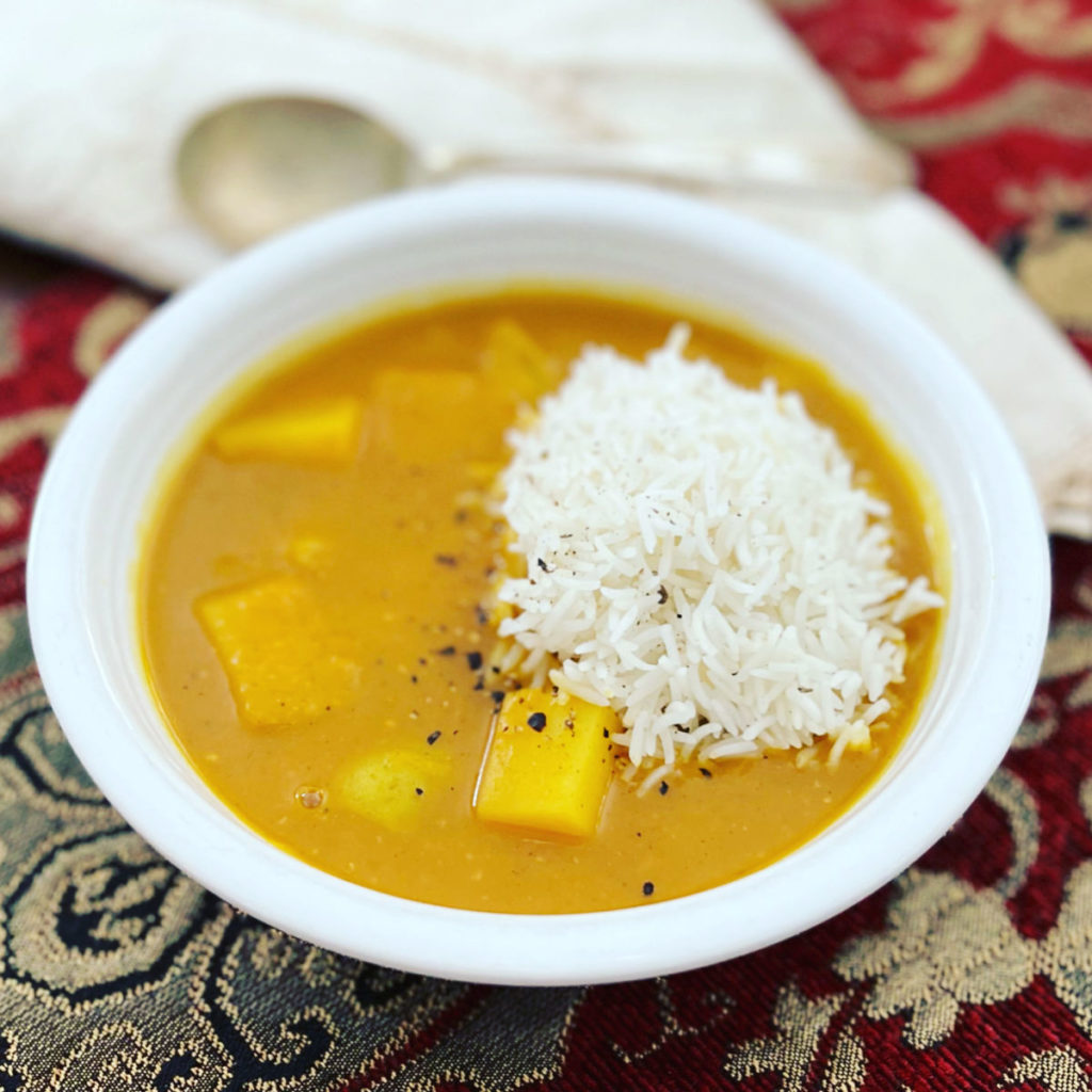 - Ladle soup into bowls and serve with or without cooked basmati rice. Garnish with thin sliced pear.