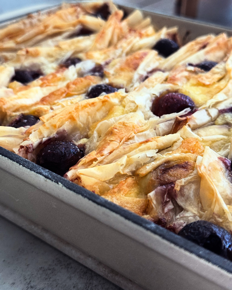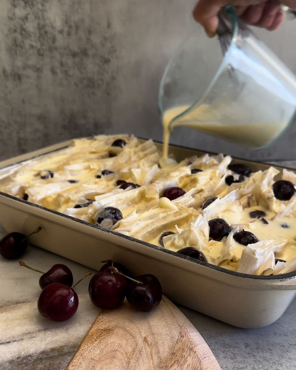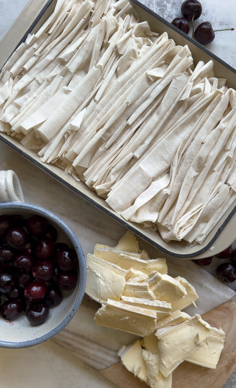 Indulge in the delightful fusion of flavors with our fresh cherry and brie Filo gratin.