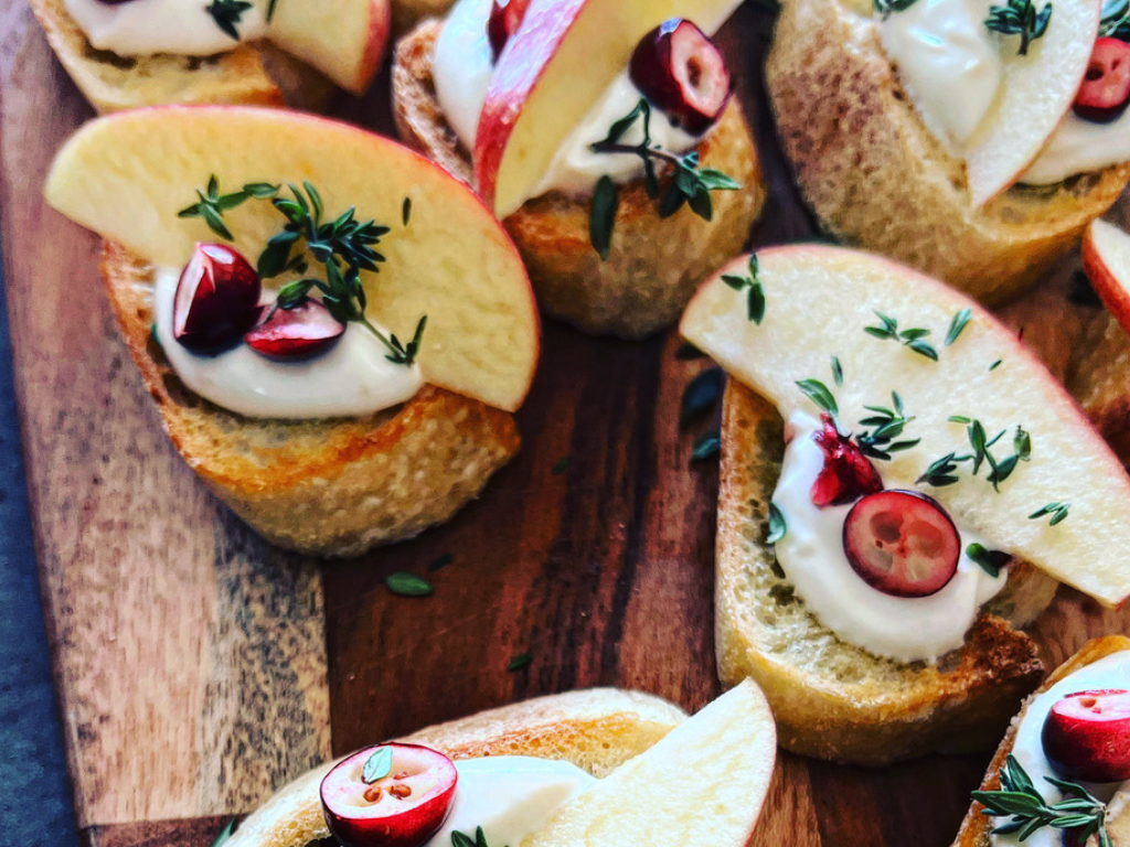 Who wants an impressive appetizer with minimal effort? Everyone! Joyfully Grown™ Gala Apples star in this two-bite tidbit. They have a sweet flavor with floral notes and hints of vanilla which complement the tart fresh cranberries, playing perfectly with the citrus whipped ricotta that we will sweeten lightly with pure maple syrup. If you think that’s a mouthful, wait till you get your hands on one, or three! Since there isn’t a whole lot of cooking involved, you’ll have this starter out as fast as you can slice, chop, broil, and whip. These toasts are ideal for a holiday gathering or any event where hors d’oeuvres are desired!