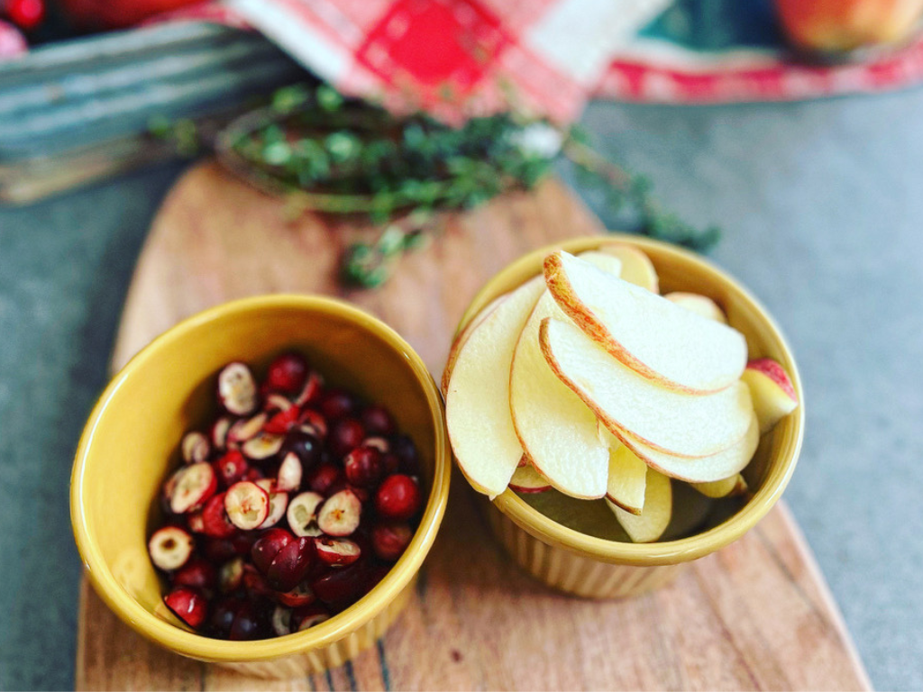 - Meanwhile, chop the cranberries, thin slice the Gala apples and ready the thyme sprigs