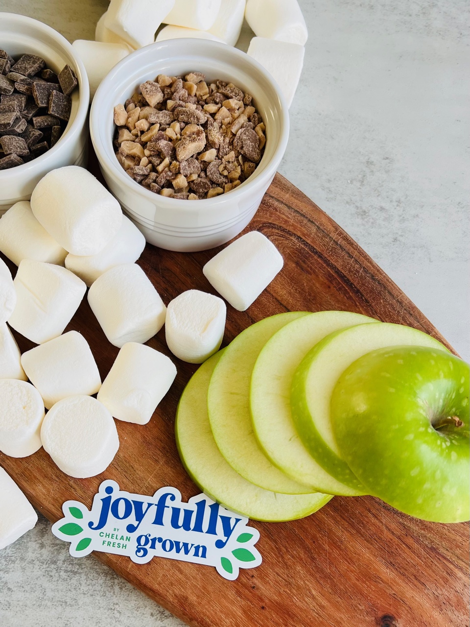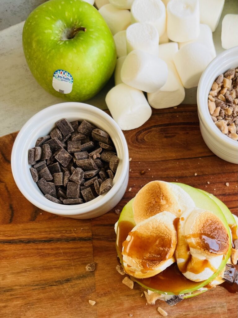 This recipe will show you how to make delicious s’mores anytime, in any weather and for any occasion! Because we are replacing the graham crackers with apple slices, this is a great gluten free option for you or your guests. Tart Granny Smith apples shine through the sweetness of the toffee candy, chocolate chips and toasty marshmallows. Broil your marshmallow to golden perfection in the oven, instead of the hassle of building a campfire!