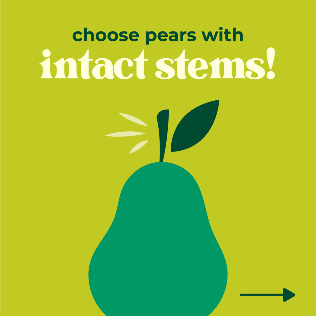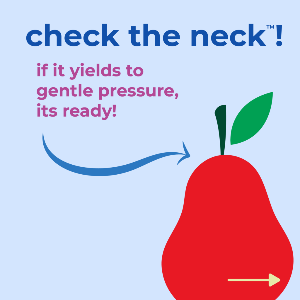 Determining when a pear is perfectly ripe can be a bit tricky. While the skin color of varieties like Bartlett brightens as they ripen, most other pear varieties show little change in color. For these non-Bartlett pears, the best way to judge ripeness is to use the “Check the Neck” method. Simply apply