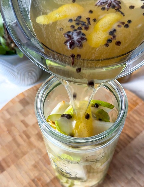 - Carefully pour the hot brine over the pears, ensuring they are fully submerged.