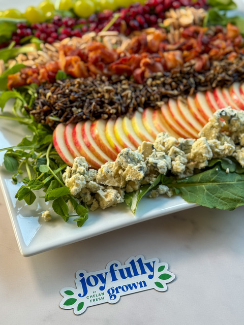 - Finish with a garnish of cotton candy grapes and crumbled Gorgonzola cheese in separate sections or as desired.
