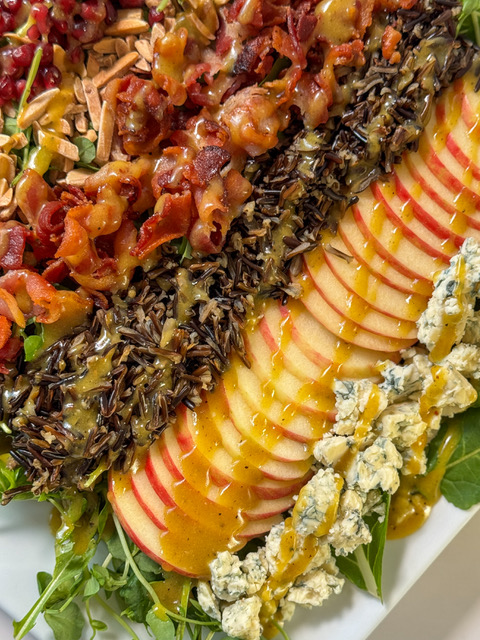A stunning combination of vibrant colors and complementary flavors, this Layered Wild Rice & Honeycrisp Salad is as much a visual masterpiece as it is a delicious meal. The crisp sweetness of Honeycrisp apples, the savory crunch of bacon and toasted almonds, and the tangy burst of pomegranate seeds come together atop a bed of fresh greens. Finished with a drizzle of a bold and slightly spiced maple dressing, this salad is perfect for celebrations or a delightful weekday indulgence. This gorgeous salad is perfect for any gathering or as a show-stopping addition to your table. Packed with fresh ingredients and drizzled with a flavorful dressing, it’s as nutritious as it is beautiful.