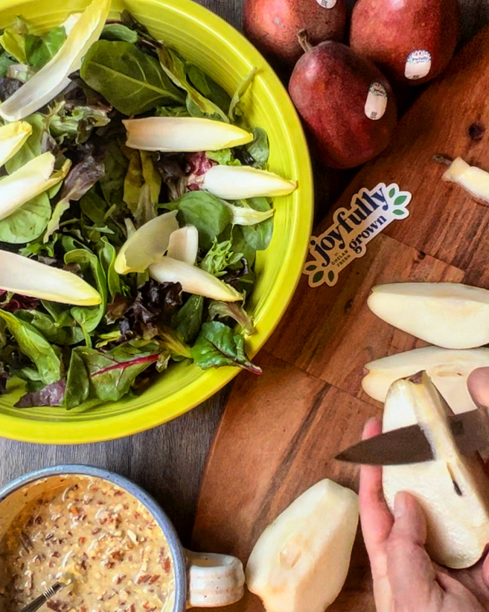 4. Combine the mixed greens and endive in a large bowl, toss the thin sliced pears atop the salad.