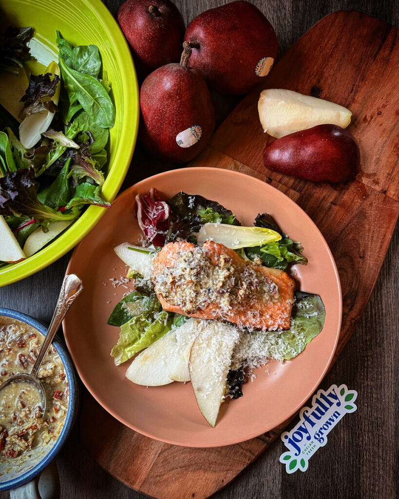 If you are looking for a quick, weeknight dinner or impressive weekend brunch, this recipe checks all the boxes! I use wild salmon, but you are welcome to use farmed salmon if you wish. Both wild and farmed salmon have benefits! While wild salmon might be considered the better choice, it is more expensive making farmed salmon the more affordable option. Red Pears are a perfect accompaniment to salmon. The subtle sweet flavor and smooth texture combined with a squeeze of fresh lemon juice, pushes this over the top and balances the richness of the pecan, Dijon dressing.