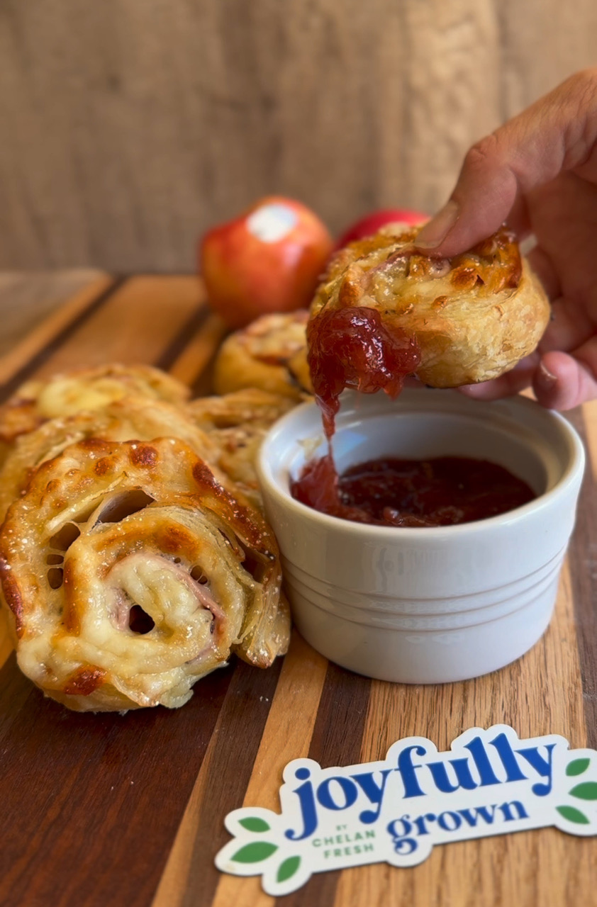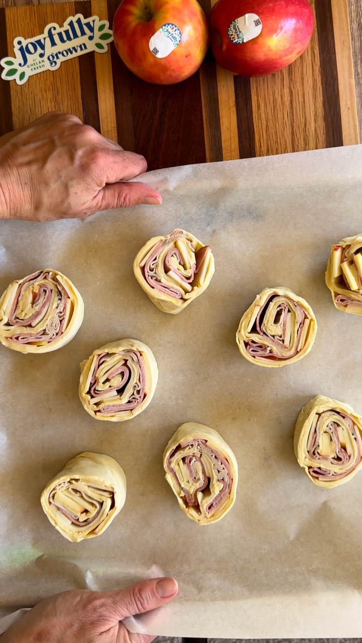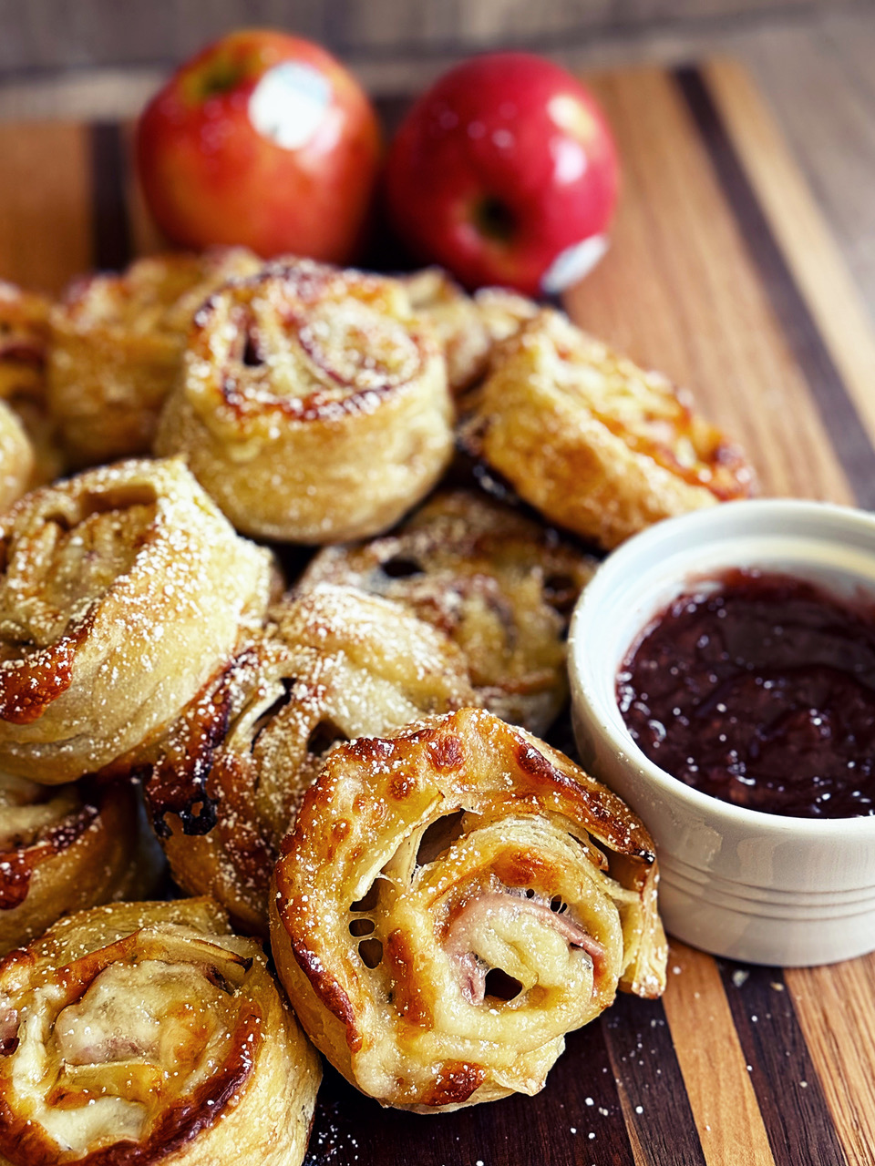This Pink Lady Apple Monte Cristo Pinwheel recipe, offers a delightful twist on the classic Monte Cristo sandwich, transforming it into a visually appealing and delicious appetizer or snack. Combining the flakiness of puff pastry with layers of savory Black Forest ham and cracked pepper turkey, balanced by the subtle sweetness of Pink Lady apple slices and the tanginess of Dijon mustard, each bite is a harmonious blend of flavors and textures. The addition of Provolone cheese adds a creamy richness to the dish. After baking to golden perfection, a dusting of powdered sugar adds a touch of sweetness, complementing the savory elements perfectly. Served alongside jam for dipping, these puff pastry wheels are sure to impress guests at any gathering with their elegant presentation and irresistible taste.