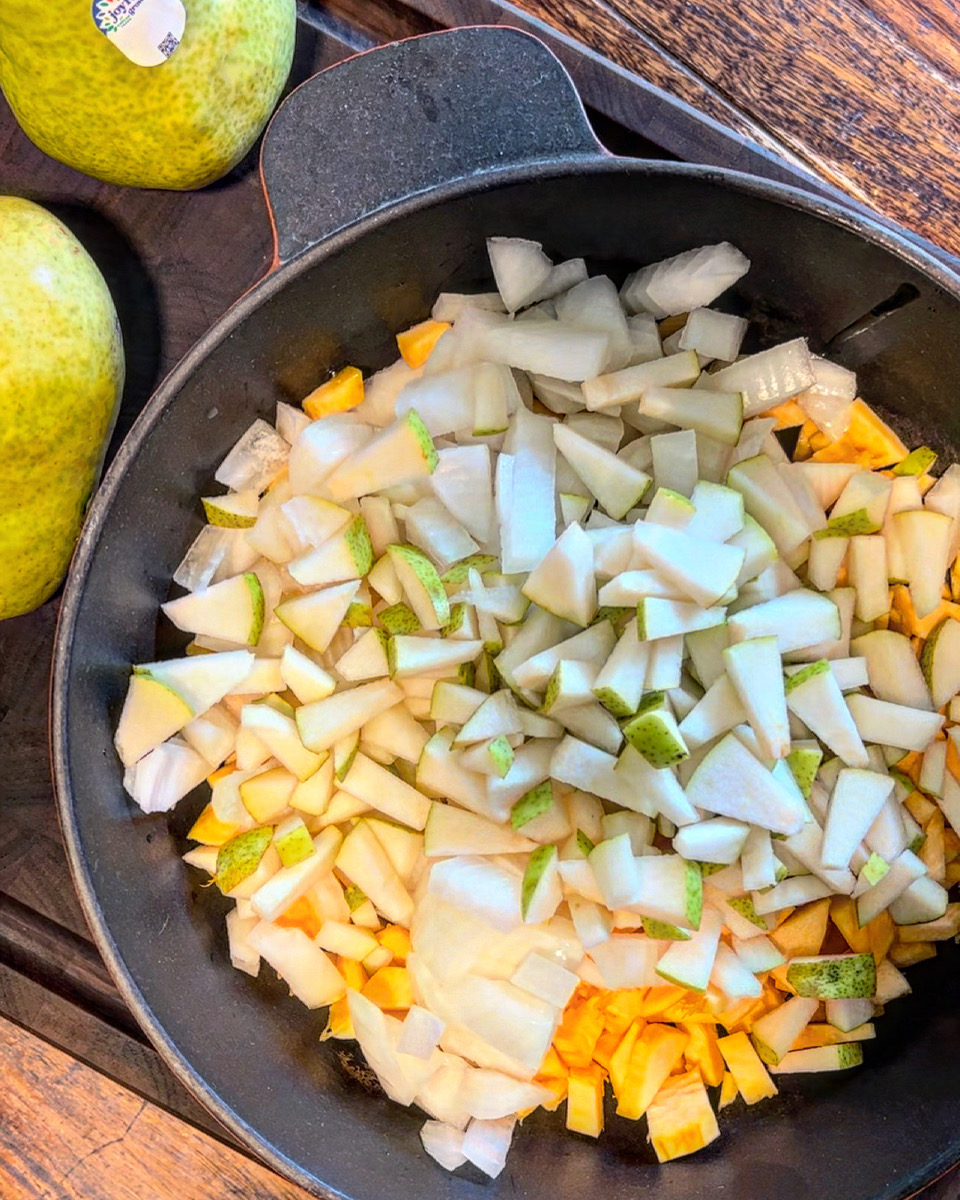 - Add olive oil to a heavy bottomed, high sided skillet followed by the pumpkin, pear, and onion.