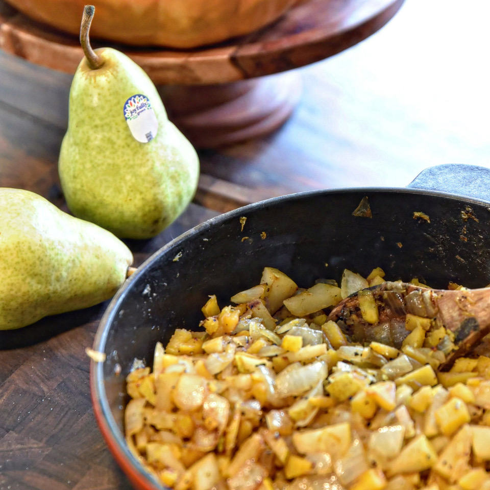 - Quarter and core your Bartlett pear. Leaving skin on, slice and dice and set aside in a small bowl. Peel, and dice your onion adding to the same bowl as the pear and pumpkin.