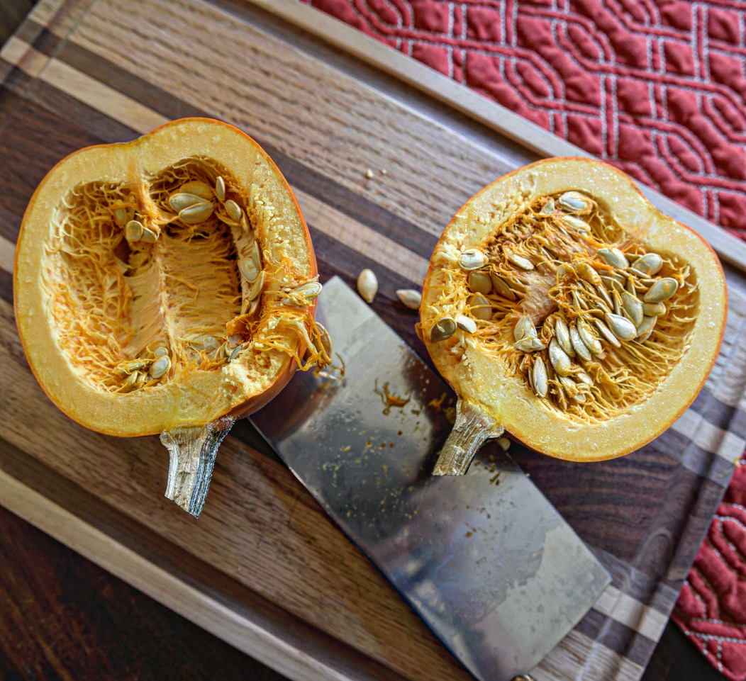 - Start with your pie pumpkin. Halve, scoop out seeds and discard. Remove the woody rind with a peeler. Slice and dice the flesh and set aside in a large bowl.