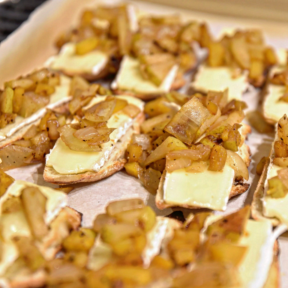 - Thin slice Brie cheese and divide among the crostini slices. Top with pumpkin pear mixture. Return the baking sheet to the oven and broil a bit longer or until the Brie cheese is bubbly.