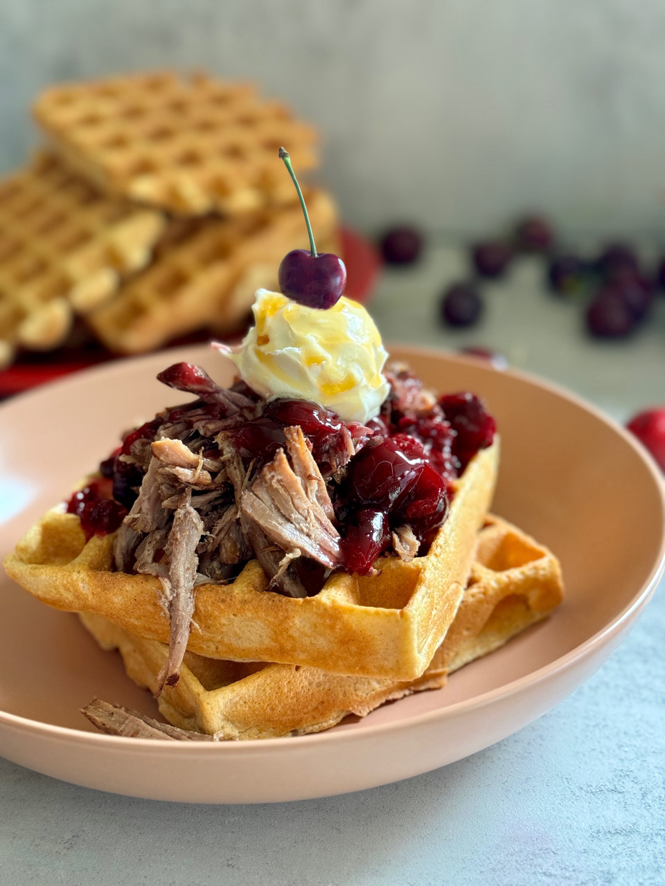 Cottage Cheese Waffles with Sweet Red Cherry Compote & Pulled Pork