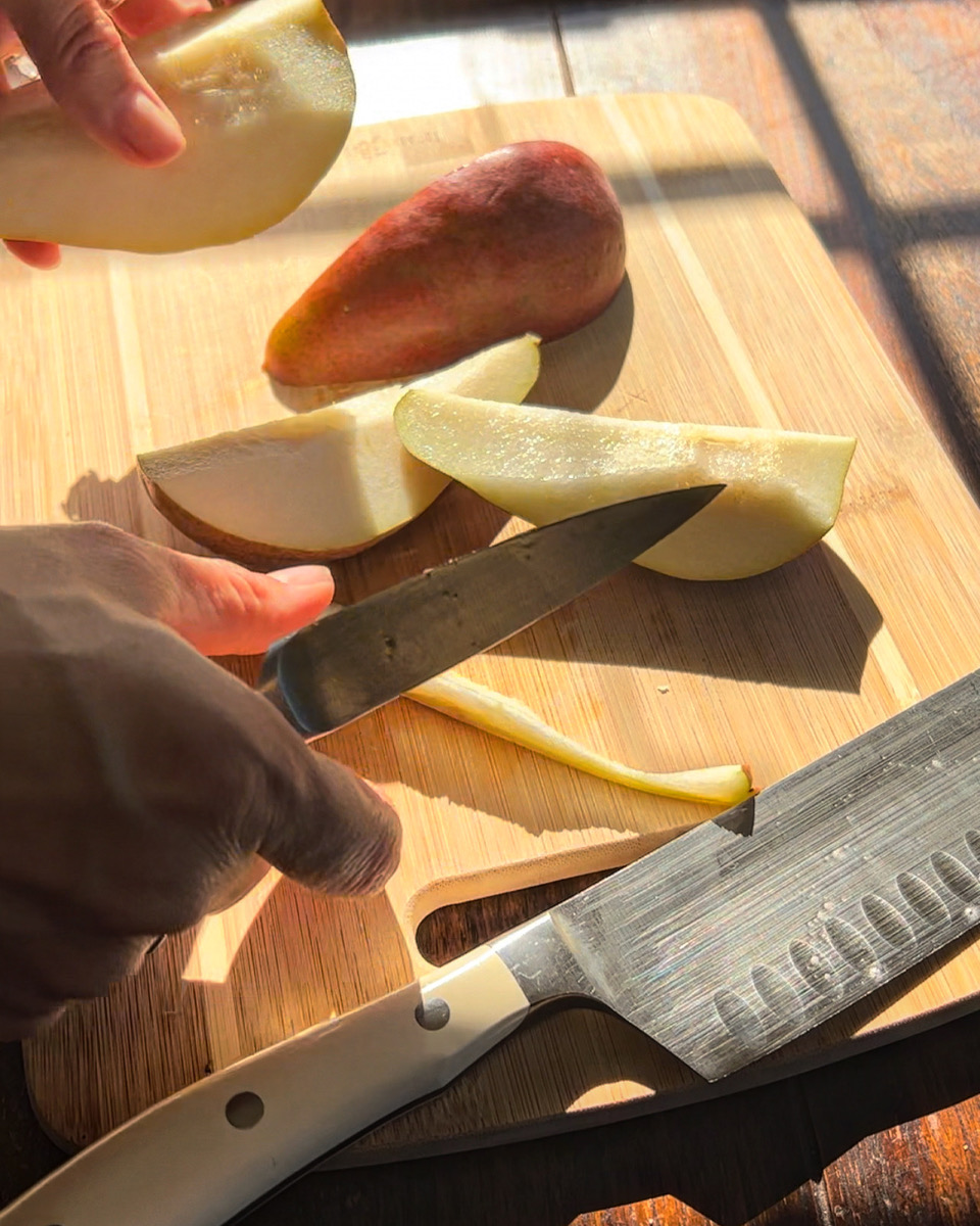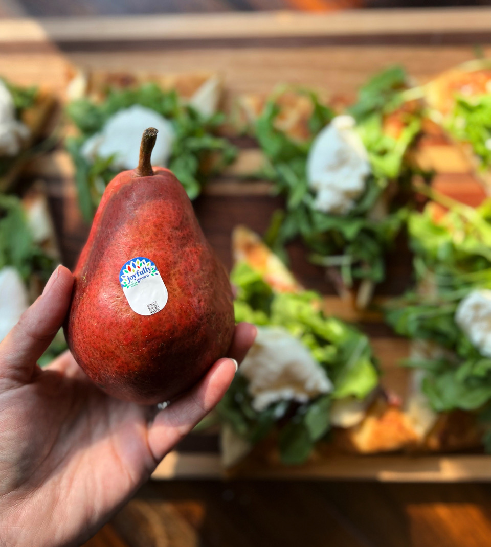 Red pear is fabulous in sweet and savory applications and ideal for flatbreads and pizzas! This recipe is great for brunch, lunch and/or dinner.  It comes together quick with simple ingredients, so it is ideal for a busy weekday or weeknight meal. Pear and prosciutto are a classic flavor paring (pun intended) and the arugula adds a bit of peppery bite.  Finish these off with a chunk of burrata for an elevated meal plan that takes less than 30 minutes from start to finish.