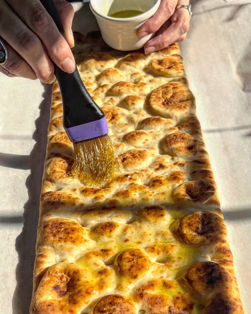 1. Preheat your oven to 425°F. Place your flatbreads onto a large cookie sheet lined with parchment paper. Using a pastry brush, evenly coat the olive oil atop the flatbread pieces.