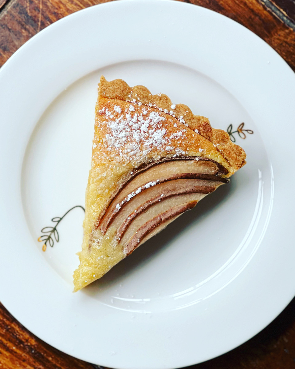 - Serving: Sprinkle powdered sugar over top of the tarte trying to avoid the pears (for aesthetic contrast). Slice into 8 even pieces & serve! This is best consumed day of but can be kept and enjoyed at room temperature for up to 2 days.