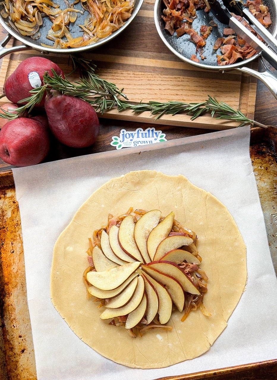 This Savory Pear & Prosciutto Galette is a beautifully layered pastry that combines rich, sweet, and savory flavors in each bite. The star of the dish is the red pears, which are thinly sliced and marinated in a blend of maple syrup, vanilla, and cardamom, giving them a warm and fragrant depth that perfectly complements the other ingredients. As the galette bakes, the pears soften and release their juices, enhancing the caramelized onions and crisped prosciutto layered beneath them. Topped with creamy gorgonzola and finished with a rosemary-infused glaze, this galette is both rustic and elegant, making it an ideal choice for gatherings or a cozy night in.