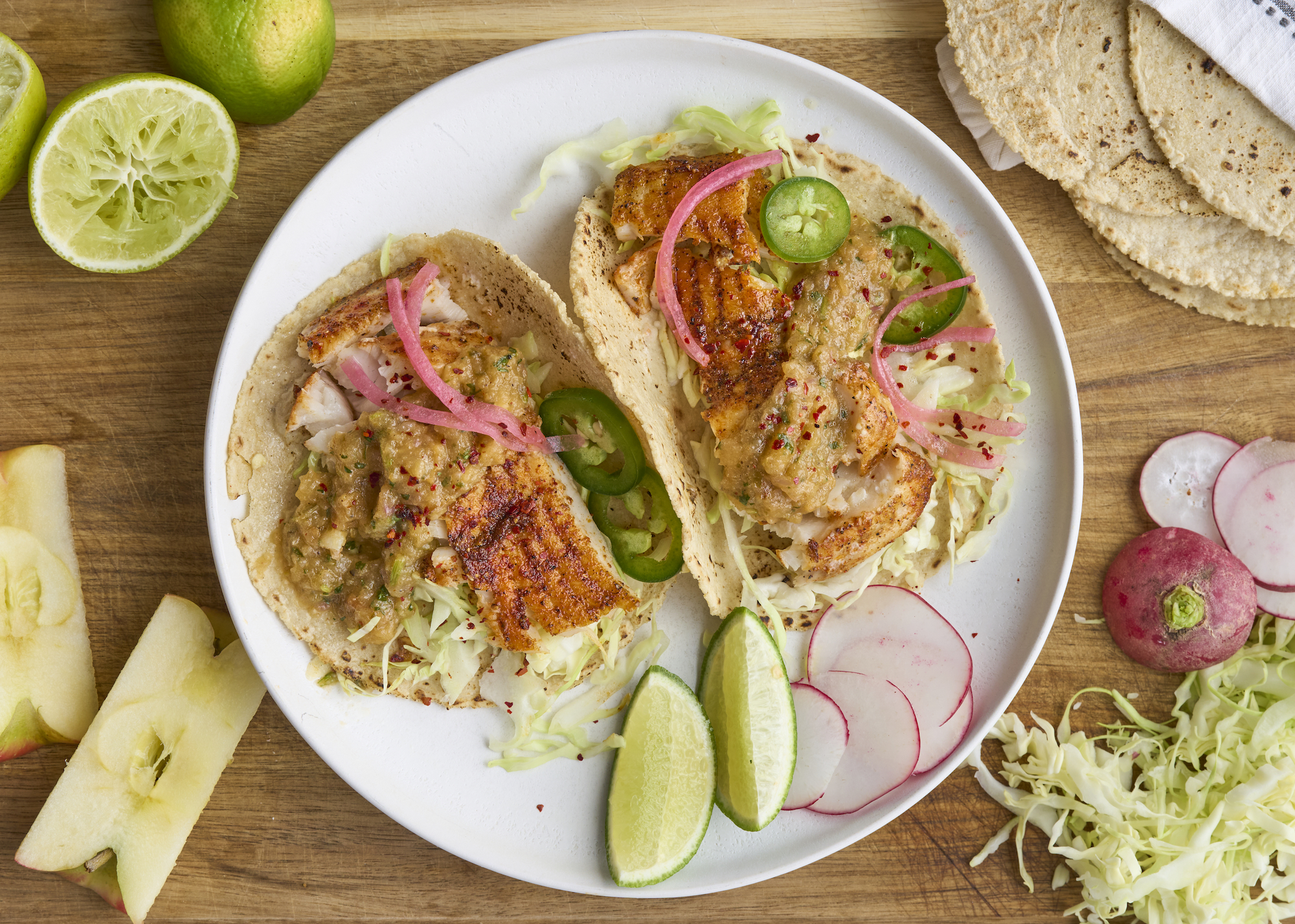 Smoky, caramelized apples and pears blitzed into a chunky, tangy salsa—perfectly spooned over flaky, roasted white fish. Finished with fresh cilantro, jalapeño, toasted sesame seeds, and served in warm tortillas with crisp shredded cabbage.
