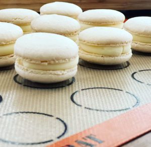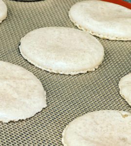 8. Bake your macaron shells for 15-18 minutes (depending on size) rotating halfway through, until hard and ever so slightly golden. Allow the shells to cool completely before transferring to a cooling rack. When they are completely cool, they should peel off easily from the baking mat or parchment.