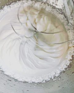 5. Add the egg whites and about 3 tbsp. of sugar to a metal bowl. Place bowl over a pan filled with boiling water (like you would use a double boiler) and whisk until the sugar melts completely and becomes white and frothy. Transfer the egg whites to a stand mixer and slowly add the remaining sugar.  Beat this mixture on high until stiff peaks form and it becomes glossy.