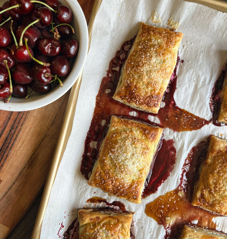 We have all heard of cherries and cheesecake, and cherry cheesecake, but what about cherry cheesecake upside-down pastries? This is our version of the viral pastry food trend, featuring delicious, sweet red cherries as the star of the show. We simplify this recipe by using store-bought puff pastry dough that is ready to bake and whipped cream cheese. The tanginess of the cream cheese pairs perfectly with the cherries and is enveloped in buttery flakey dough. Doesn’t get better than that!
