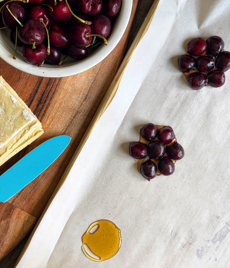 - On top of the honey, place the halved cherries in groups of 7 arranged to look like a flower.