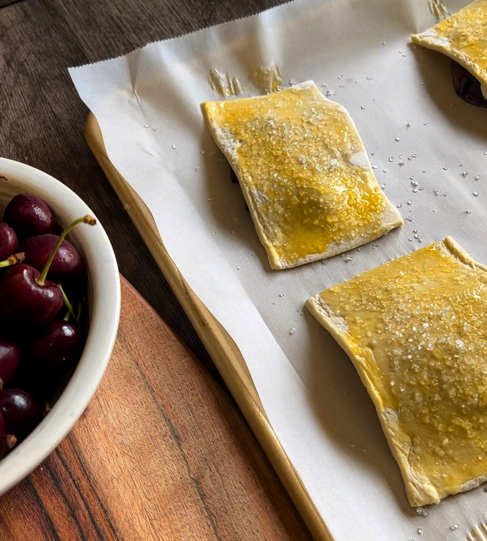- Drape a rectangle of puff pastry over each pile of cherries, brush with egg wash, sprinkle with sparkling sugar.