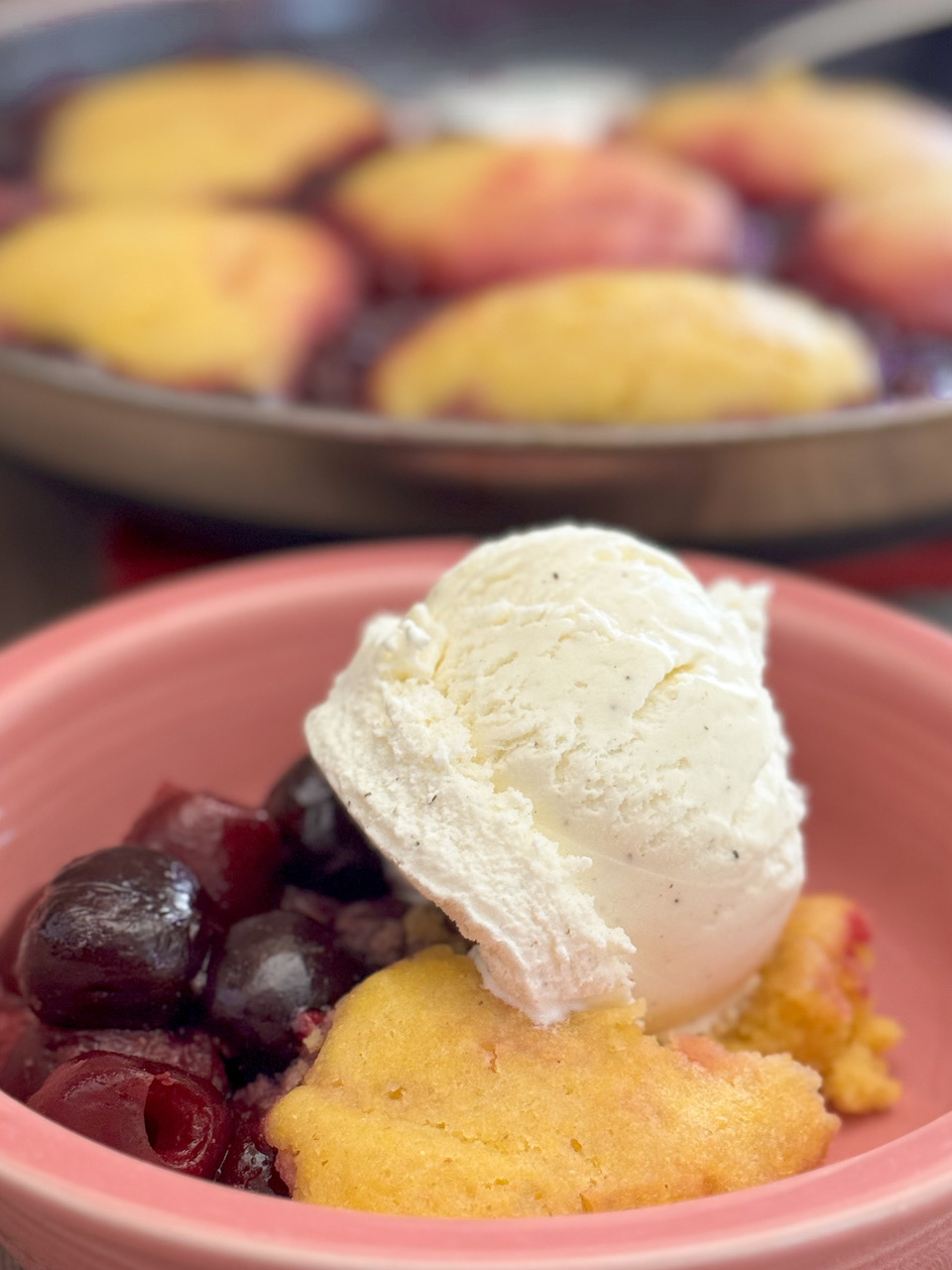 - Reduce the heat to low and spoon the dumpling batter over the simmering cherry mixture in the saucepan.