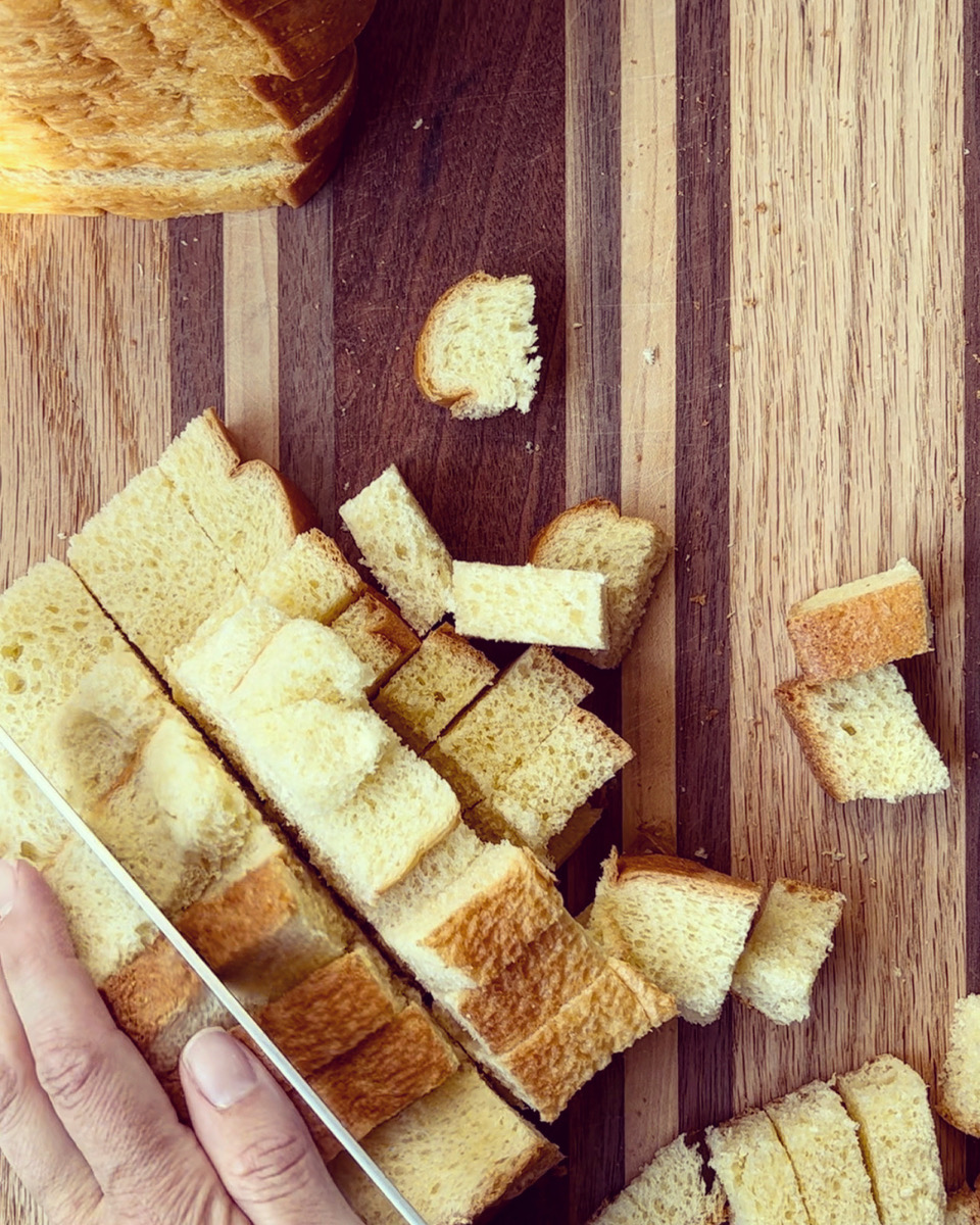- Meanwhile, while the mixture cools, grease a 6-cup casserole dish. Cube brioche bread and place in the prepared dish. Set aside.