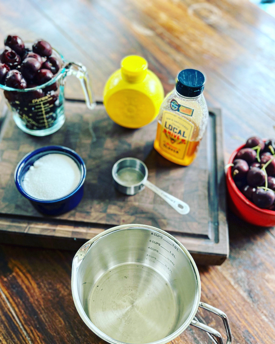 - Add the pitted cherries, granulated white sugar, honey and lemon juice to a medium sized pot and allow to sit for 5 minutes stirring frequently to release some of the juices.