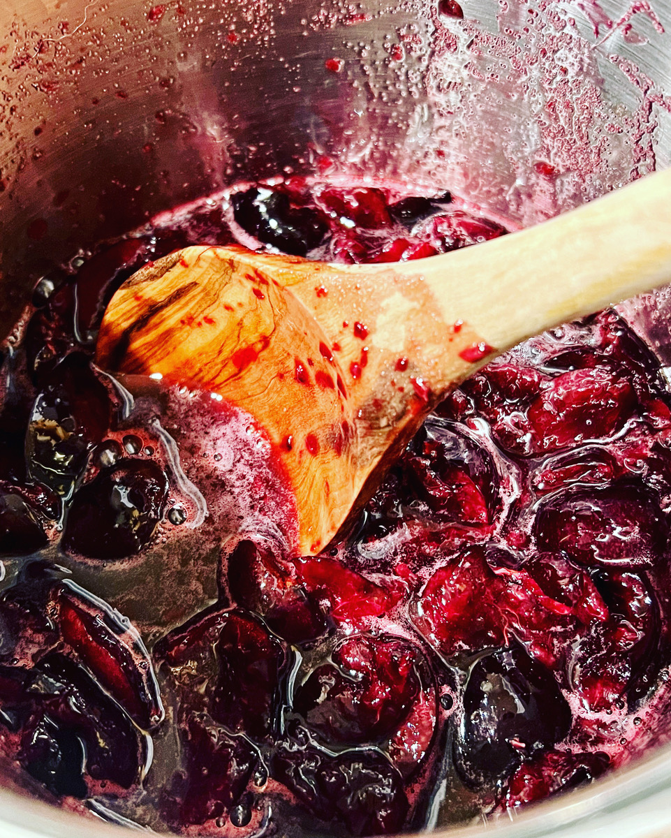 - When the 30 minutes have passed, mix the cornstarch and water, add the slurry to the cherry mixture, and stir until thickened. Remove from heat.