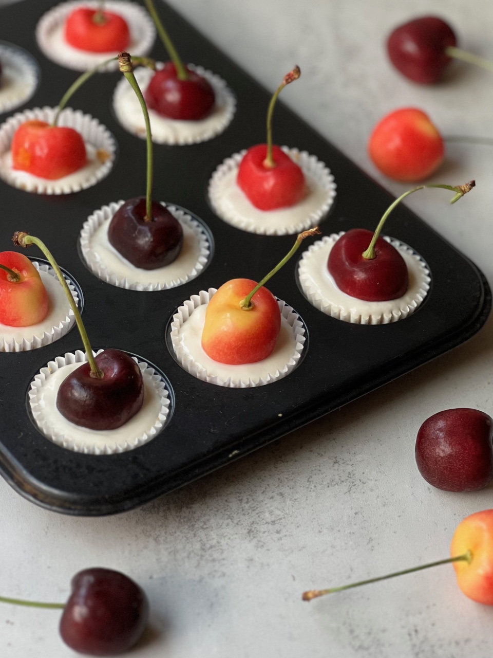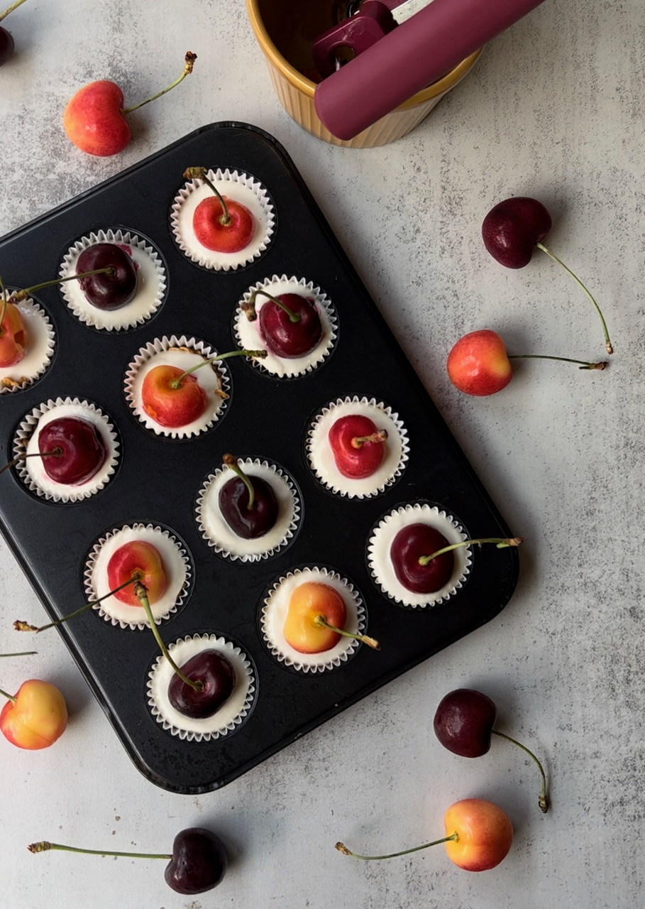 6. Place a cherry into each muffin cup pressing down only slightly.