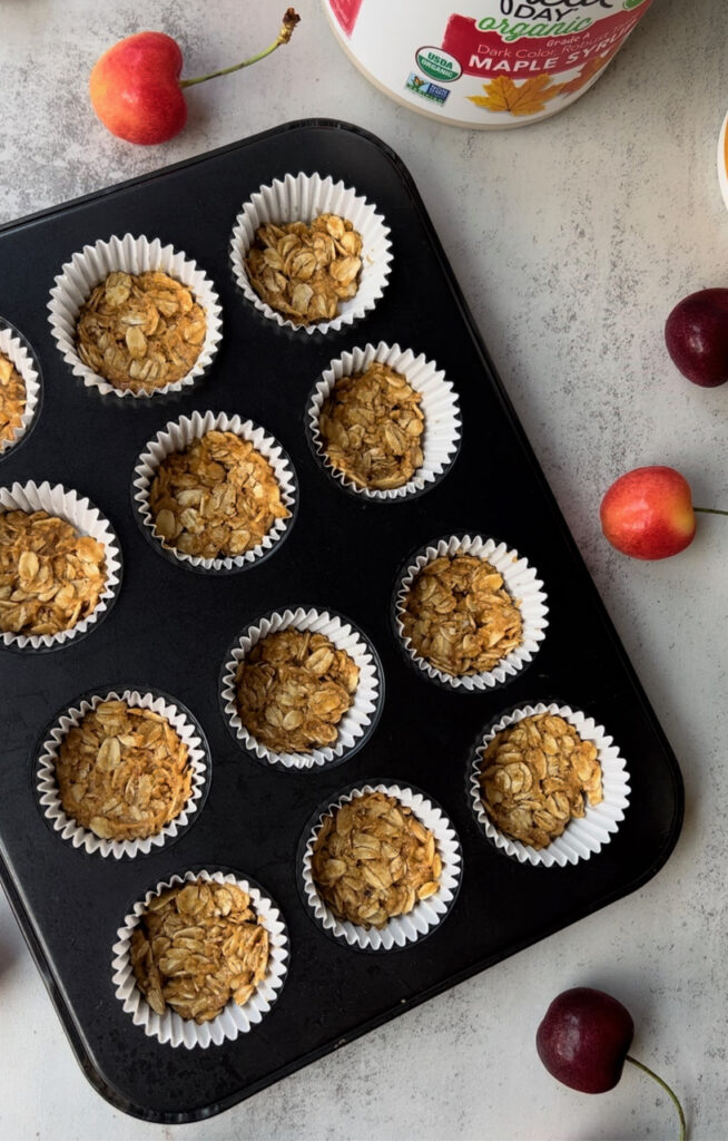 3. Add a tablespoon of the oat mixture to the bottom of each muffin cup and press down